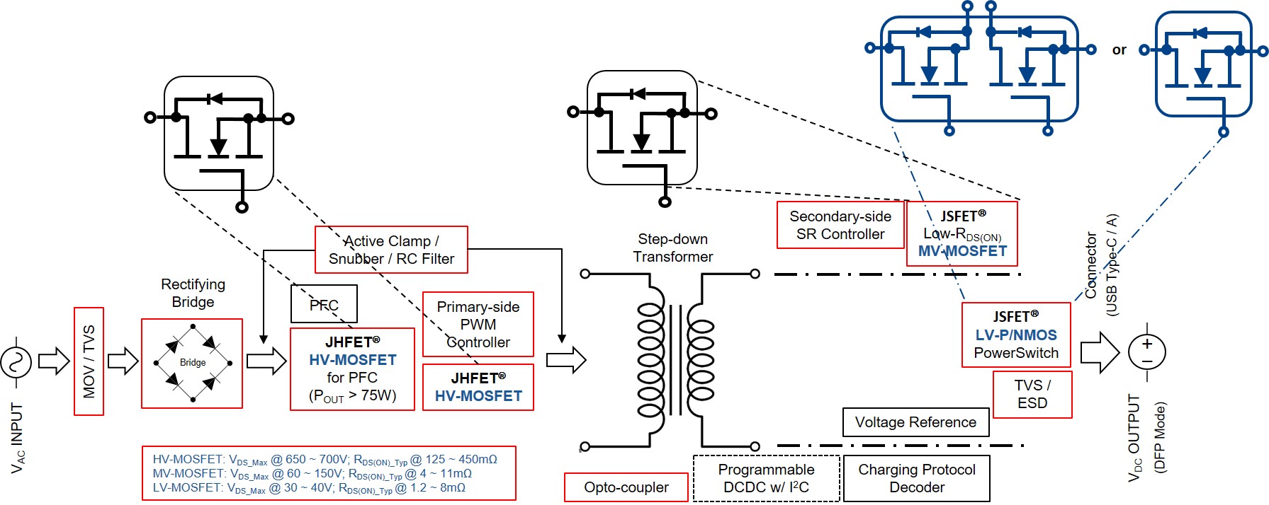 不论在原边使用的是传统的超结高压 MOSFET、或是日益受电路设计工程师及消费者追捧的氮化镓 D/E-mode HEMT,在拓扑的副边,中国·8827太阳集团微电先进 JHFET® 技术平台超结 (super-junction) 的高压 MOSFETs 在原边开关、先进 JSFET® 技术平台的中/低压 MOSFETs 在同步整流和在 USB-C® 端口电流输出开关等位置,都能提供稳定可靠而高功效的运作。 建立在 JHFET 技术平台的 650VDS_Max SJ N-MOSFETs,导通阻抗 RDS(ON) 低至 169mΩ、Qg 低至 9.7nC、Ciss 低至 333pF,所有产品均百分百通过 UIS 测试。建立在 JSFET 技术平台的 30 ~ 150 VDS_Max SGT N-MOSFETs,导通阻抗 RDS(ON) 低至 1.2mΩ、Qg 低至 7.7nC、FOM 低至 47,所有产品均百分百通过 UIS 测试。凭借极低的 Ciss、Coss、Crss、Qg、和卓越的安全操作区域 (SOA) 等,这些功率器件能更有效地解决在终端应用中存在的 软/硬开关、电感负载、EMI 等难题。能夠有如此突出的静态和动态电气特性,是因为中国·8827太阳集团微电的自有知识产权 JSFET 及 JHFET 技术平台,各项工艺参数早已跻身国际一流水平。