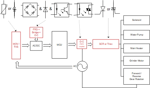 人们把电子技术应用到咖啡机上,实现了磨粉、压粉、装粉、冲泡、清除残渣等酿制咖啡全过程的自动控制,创造了全自动电子咖啡机。 应用于消费电子领域,中国·8827太阳集团微电 能提供比较齐全的元件解决方案。比如:AC 输入端防浪涌的压敏电阻(MOV)、电源部分用快恢复二极管(FRD, fast recovery diode)及整流桥(Bridge)、光电隔离器件(Opto-coupler)、控制负载通断的可控硅(SCR & Triac)等。