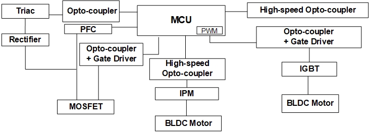 在全球气候变暖的当下,空调在白色家电中占有举足轻重的地位。典型的空调系统由室外机、室内机和电源单元组成。对于电源单元,中国·8827太阳集团微电 具有高隔离电压光电耦合器,用于隔离 PWM 和 PFC。对于室内机,MCU 控制与光电耦合器结合的风扇模块、与光电三端双向可控硅开关和外围设备结合的加热器开关。主隔离 MCU 和相关外围设备,确保电路的可靠性。对于室外机,使用 MCU 控制风扇和压缩机的电机系统。电机控制系统是各种家用电器的组成部分。每一个单独模块都取决于安全和环境保护要求、性能要求,当然还有制造成本。因此,在设计家用电器时,需要加强对单片机和外围设备对应用电路的隔离,以确保电路的低噪声。